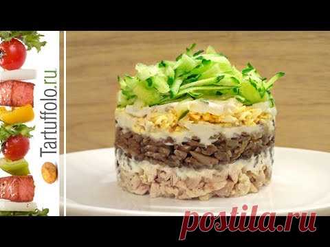 Необычный праздничный салат с курицей и грибами. Простой рецепт.