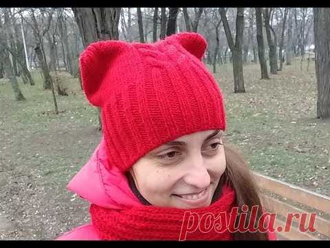 ШАПОЧКА "КОШКА" ВЯЗАНАЯ СПИЦАМИ.Шапка с ушками и жгутами-видео урок