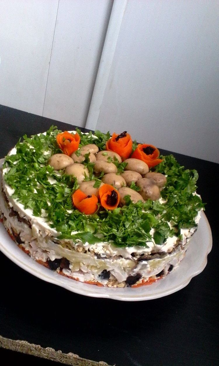 Слоеный закусочный торт с копчёной курицей, черносливом и шампиньонами - Простые рецепты Овкусе.ру