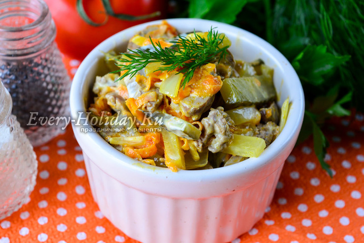 Салат "Обжорка" с печенью, классический рецепт с фото