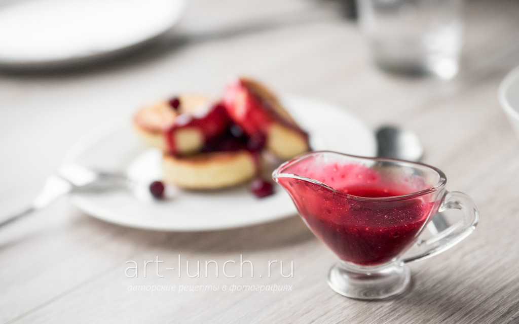 - Вот теперь клюквенный соус точно готов. Осталось только дождаться пока он остынет. С таким соусом даже самое обыкновенное блюдо превращается в праздничное угощение. Готовый соус можно хранить в холодильнике недели две. Ну, а подал соус я к сырникам. Также мне нравится клюквенный соус с блинами или панкейками. Приятного аппетита!