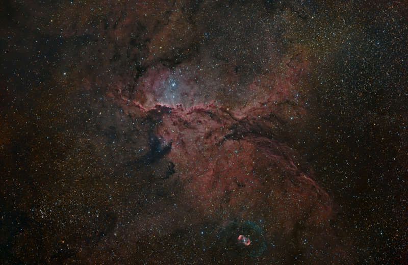 В облаках светящегося водорода туманности NGC 6188 таятся фантастические формы. Эта эмиссионная туманность находится на краю большого молекулярного облака, невидимого в оптическом диапазоне, на расстоянии около 4 тысяч световых лет от нас в южном созвездии Жертвенника. Туманность окружает молодые массивные звёзды ассоциации Жертвенник ОВ1, сформировавшиеся в этом месте всего несколько миллионов лет назад.