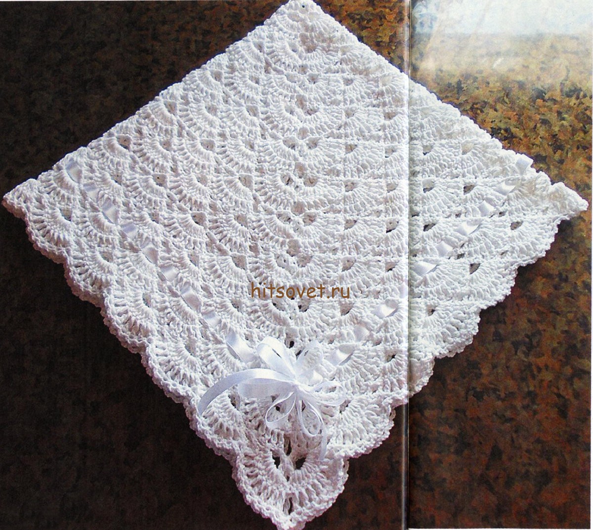 Плед крючком для новорожденных - Хитсовет Плед крючком для новорожденных. Красивый плед, связанный крючком для новорожденных со схемой. Вам потребуется: пряжа Jeans, состоящая из 55% хлопка и 45% полиакрила, 160 метров в 50 граммах - 300 грамм белого цвета, крючок № 3,5; 4,5 метра атласной ленты шириной 1 см.