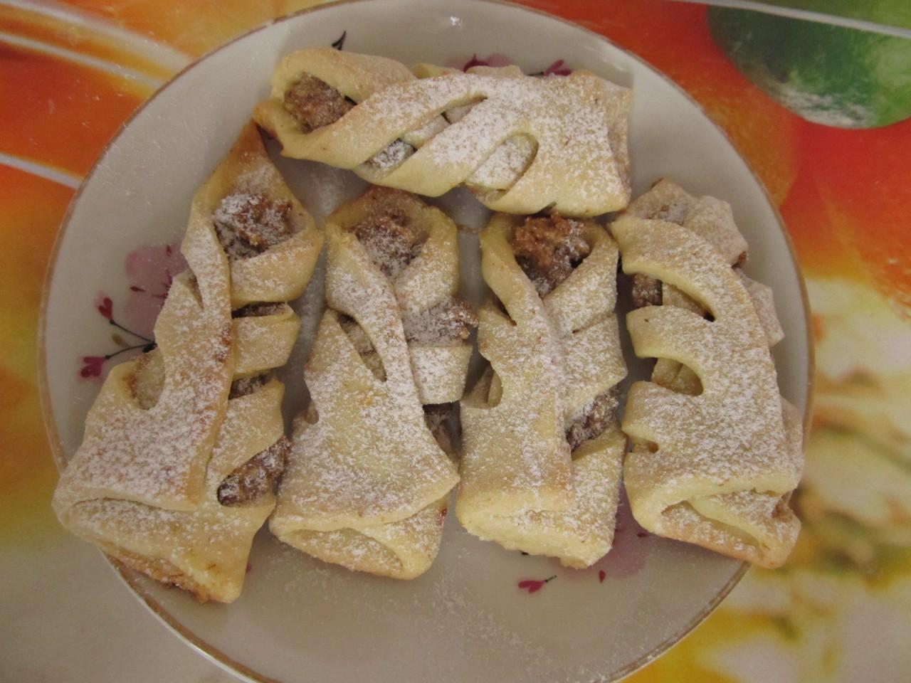 - Шаг 1: Ингредиенты.Шаг 2: Растираем размягченное сливочное масло с сахаром и ванилином.Шаг 3: Добавляем яйцо и хорошо перемешиваем.Шаг 4: Затем добавляем натертую на мелкой терке апельсиновую цедру.Шаг 5: Добавляем молоко, тщательно перемешиваем.Шаг 6: И всыпаем просеянную муку с разрыхлителем.Шаг 7: Быстро замешиваем тесто, скатываем в шар и убираем в холодильник на 30-40 минут.Шаг 8: Тем временем готовим начинку. Грецкие орехи измельчаем на блендере, перемешиваем со взбитым белком и сахаром. Начинка готова.Шаг 9: Охлажденное тесто делим на 3 части. Каждую раскатываем в круг на столе, присыпанном мукой. Каждый круг разрезаем на 6 сегментов-треугольников.Шаг 10: В каждом треугольнике делаем косые надрезы.Шаг 11: На серединку кладем ореховую начинку.Шаг 12: Заворачиваем на нее одну сторону теста.Шаг 13: Затем другую.Шаг 14: Укладываем печенье на смазанный растительным маслом противень и ставим в нагретую до 180 град. духовку.Шаг 15: Выпекаем печенье примерно 20 минут до золотистого цвета. Важно печенье не пересушить.Шаг 16: Когда печенье остынет, можно посыпать его сахарной пудрой. Приятного чаепития!