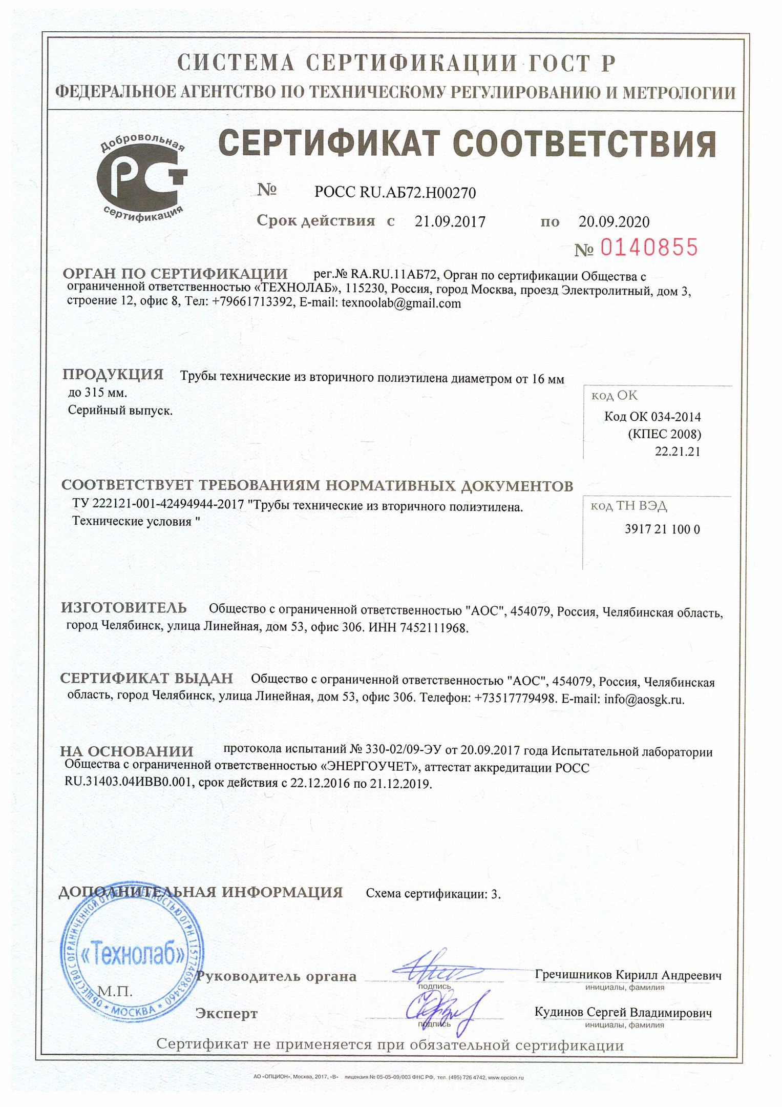 Труба ПНД техническая: сертификат соответствия ООО 'АОС' | Трубы полиэтиленовые ПНД | Сертификаты, Челябинск, +7 (351) 777-94-98