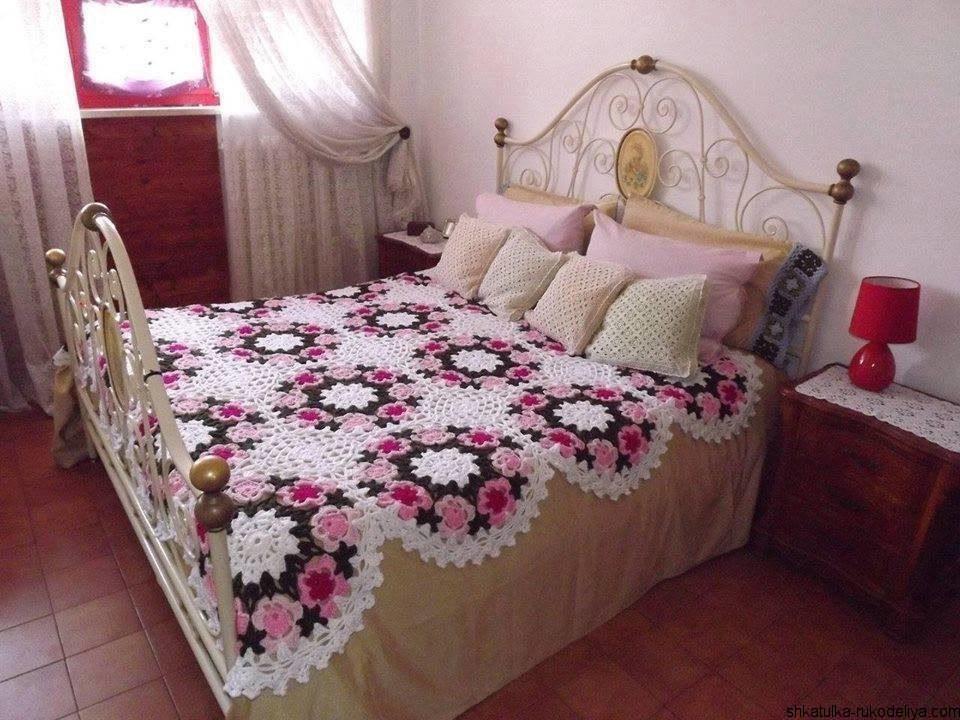 Покрывало из цветочных мотивов Покрывало из цветочных мотивов крючком. Вяжется из мотивов и соединяется в большие цветы контрастной ниткой. Далее обвязывается белой пряжей. Для вязания мотивов используйте схемы.…