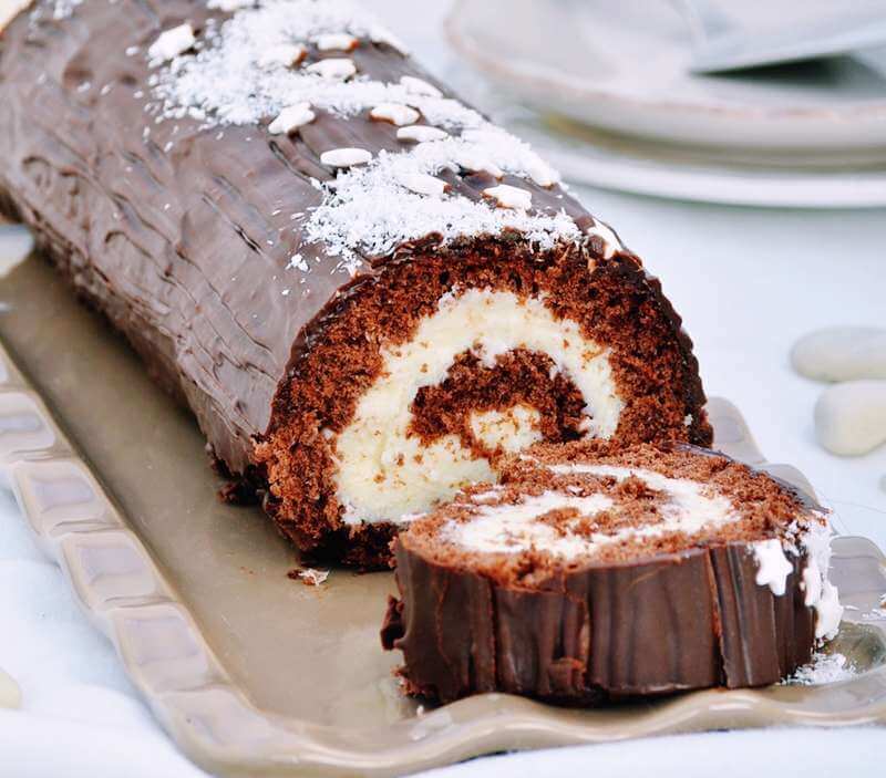 Kokos rolat Kora: 100 gr čokolade za kuvanje 80 gr margarina 4 jaja 120 gr šećera 160 gr brašna 150 ml mleka 1 kašičica praška za pecivo ( 1 kesica, 10 gr ) 1 prstohvat soli Krem: 300 ml mleka 70 gr šećera 50 gr gustina 60 gr kokosa 100 gr margarina kokos liker a