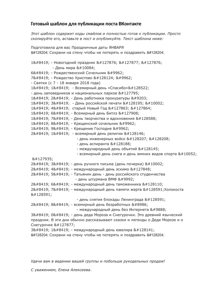 Готовый шаблон для публикации поста ВКонтакте Прздничные даты января 2018.docx — Яндекс.Диск