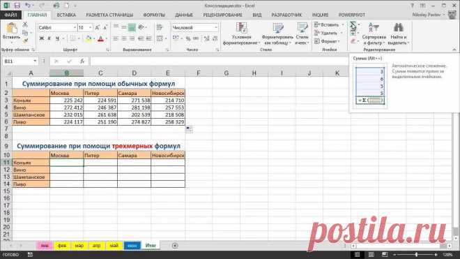 Консолидация (сборка) данных из нескольких таблиц в Excel Как собрать данные из нескольких таблиц (одинаковых или не очень) в один итоговый отчет в Excel. Подробно и с файлом примера можно найти тут - http://www.pla...