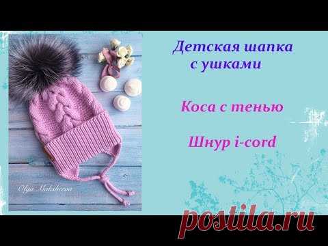 Детская шапка с ушками. Шапка с завязками. Узор коса с тенью. Шнур i-cord