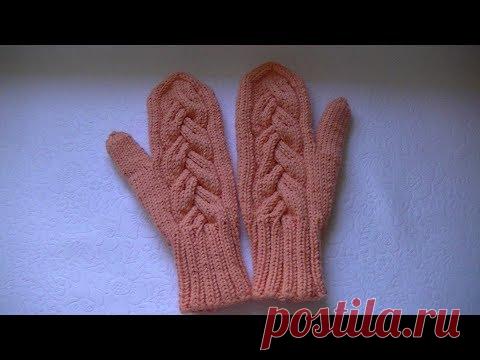 Вязаные варежки с клином для большого пальца и узором сложная коса.