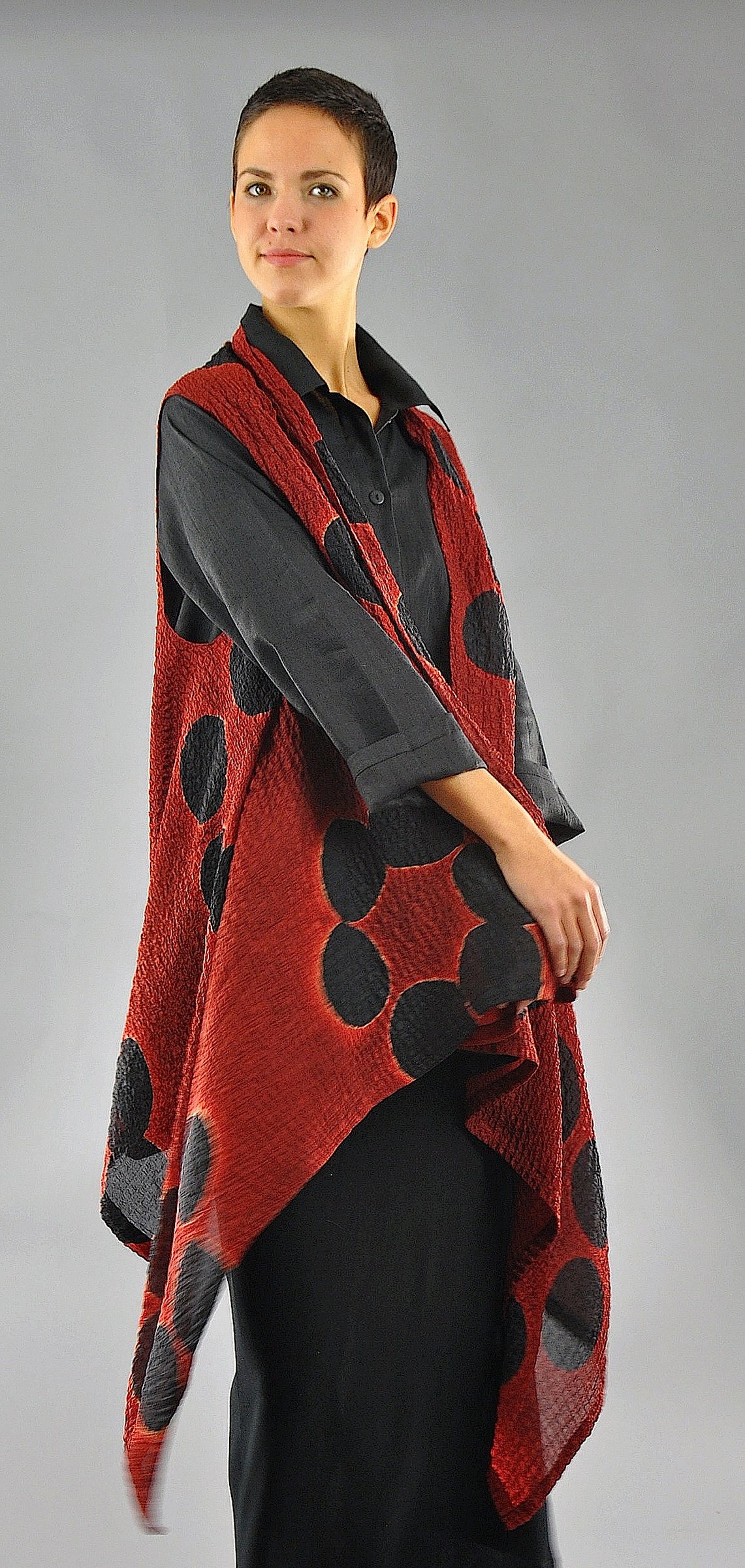Willow Vest in Red and Black by Michael Kane (Silk Vest) | Artful Home Willow Vest in Red and Black by Michael Kane . This hand-dyed silk bubble gauze vest creates a beautiful, fluid drape over the body. The artist uses Itajimi Shibori techniques to create the dot design decorating the piece’s surface. The fabric is accordion pleated, board clamped and dyed in a traditionally Japanese manner. Can be flipped and worn with more fabric around neck in a shawl fashion and cropped shorter in back.