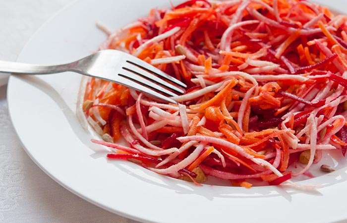 1. Берете свеклу, морковь, яблоко, капусты, режете все тонкой соломкой.