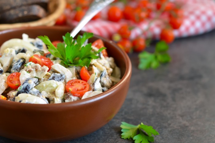 Салат с мясом и маслинами Этот питательный салат ты можешь подать как на праздничный стол, так и в будни. Главное его преимущество в том, что заправлен он будет настоящим домашним майонезом без лишних калорий