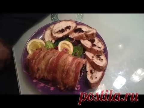 Ингредиенты : Куриное филе 700 грамм чернослив 60 грамм орех грецкий 40 грамм бекон сырой 150 грамм специи (соль, сухая аджика, специи для курицы)