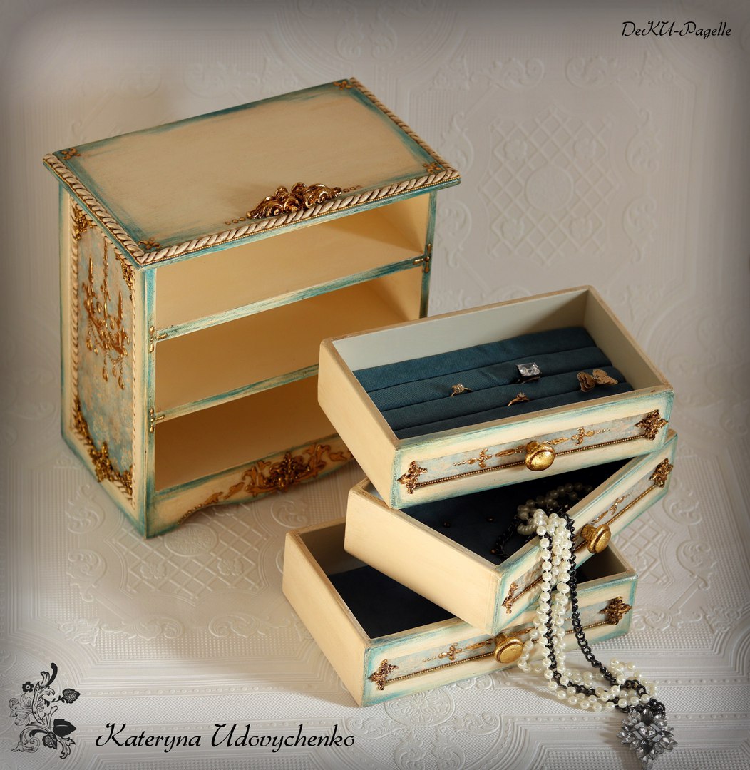 Мини-комод "Версаче". Заготовка - фанера. Техники: декупаж, лепнина, объемное трафаретирование, золочение, лессировка, патинирование. Внутри - оббивка мягкой тканью.
