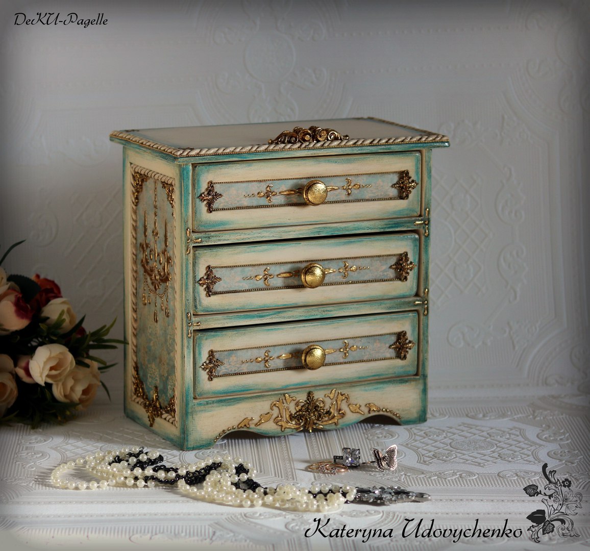 Мини-комод "Версаче". Заготовка - фанера. Техники: декупаж, лепнина, объемное трафаретирование, золочение, лессировка, патинирование. Внутри - оббивка мягкой тканью.