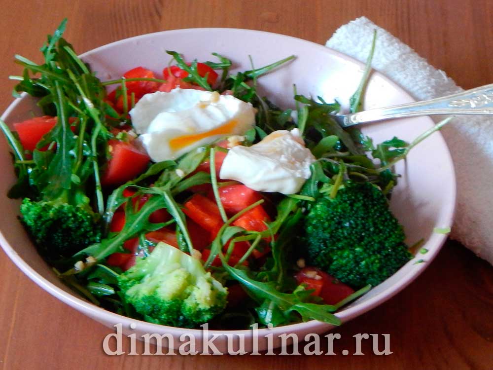 Салат с рукколой, яйцом пашот, помидором и болгарским перцем