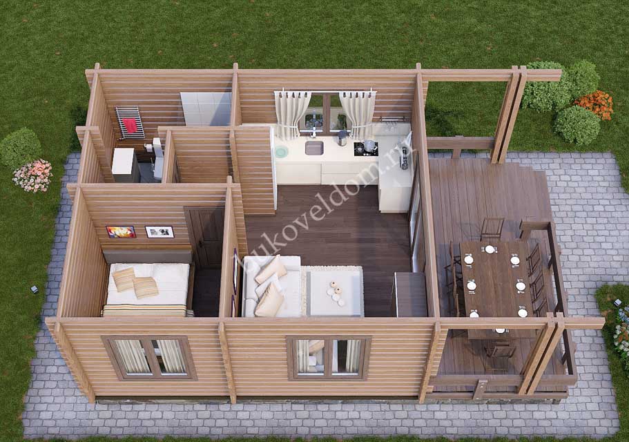 Мини-дом 41,78 кв. м одноэтажный: проект дома из клееного бруса со спальней под ключ – цена строительства от компании Буковель