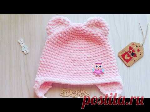 Шапочка для ребенка с ушками из плюшевой пряжи/ детская шапочка крючком 2часть