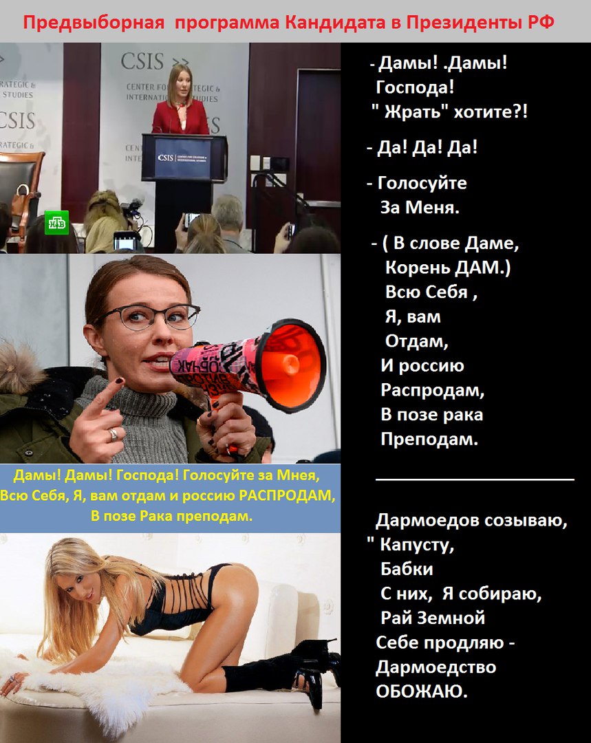 - Дамы! Дамы! Господа! Вы уехали куда. - В США, ... - Жрать хотите?! -Да! Да! Да! - Голосуйте За МЕНЯ. ( В слове Дама, корень ДАМ) Всю Себя, Я вам Отдам И россию Распродам, В позе рака Преподам. ------------------- Дармоедов созываю, " Капусту", "Бабки" С них Я собираю, Рай земной Себе продлю, Дармоедствовать, С пелёнок ЛЮБЛЮ И ОБЖАЮ.