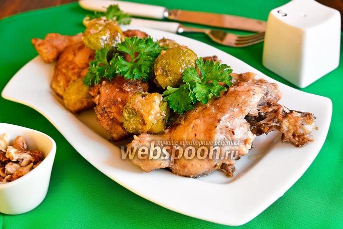 Курица с орехами и брюссельской капустой на сковороде