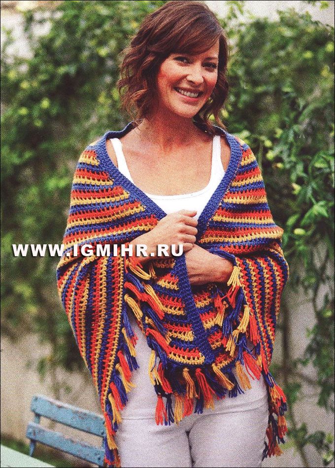 Большая треугольная шаль в разноцветные полоски. Крючок.