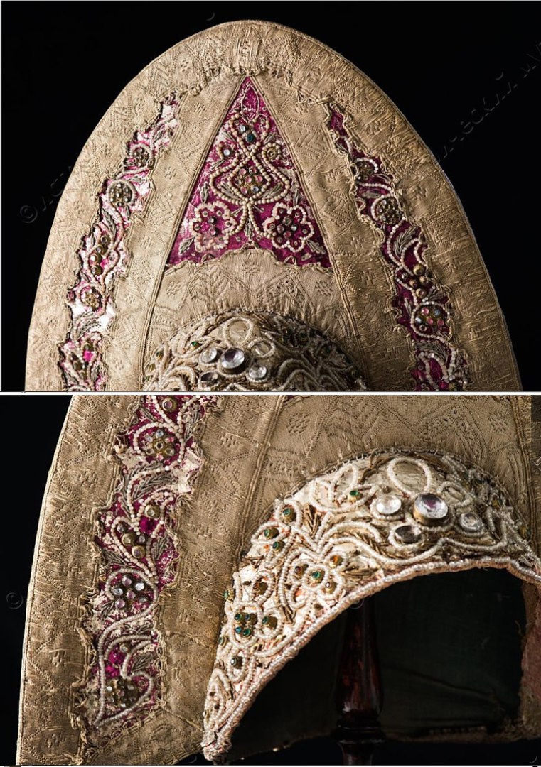 Кокошник. Владимирская губ., г. Муром II-я половина XVIII в. Бархат, золотный галун и нити, фольга, цветные стекла, желтый металл, канитель, дутые бусины под жемчуг, колотый перламутр, золотное шитье, низание Тыльная часть: 38х35 см; высота лицевой части: 18 см; очелье: 8 см