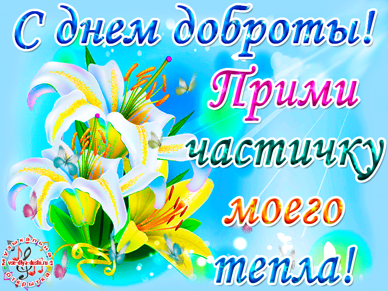 С днем доброты! http://vse-dlya-dushi.ru/s-dnem-dobroty/ Поздравляю с Днем доброты! 😍 💖 😍 Пусть доброты будет больше, больше, еще больше! Много, как воздуха, как солнца белым днем, как звезд на бархате небесном ночью! Делись ею щедро с миром, и принимай в сердце без оглядки! Пусть она украсит твою жизнь и напитает счастьем, как быстрый дождь питает мир в жаркий летний день!