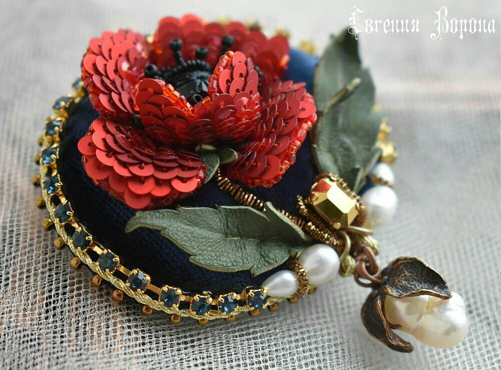 Медленно возвращаюсь в рабочий ритм... Маковка из декабрьских новинок, уже при хозяйке. Лепестки расшиты итальянскими пайетками, каждый на каркасе и каждый подшит шелковым бархатом. Основа броши так же выполнена из шелкового бархата, листья из натуральной кожи, окантовка из стразовой цепи и пресноводного жемчуга, изнанка оформлена натуральной кожей. Для подвески использована крупная барочная жемчужина и элемент авторской фурнитуры @annabronze , который нещадно пришлось до...