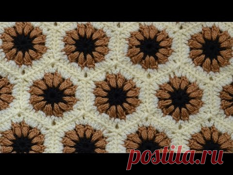 Как связать трехцветный шестиугольный мотив крючком. How to crochet The hexagonal motif.