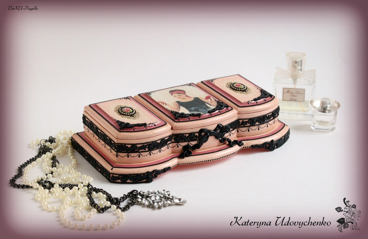 Шкатулочка на три отделения "Катарина". Ольха. Техники: декупаж, лепнина, точечная роспись, патинирование. Внутри оббивка мягкой тканью.