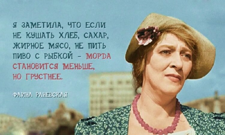 30 цитат несравненной Фаины Раневской - Kolibri-Journal Блистательная актриса Фаина Раневская полюбилась зрителям своими острохарактерными ролями в театре и кино. Удивительно то, как слова, произнесенные актрисой много лет назад, звучат броско и по делу сегодня. И словно видится лукавый прищур ее глаз, тонкая нервная рука с неизменной папироской и насмешливо искривленные губы… Мы решили вспомнить остроумные высказывания великой актрисы, которые в свое …