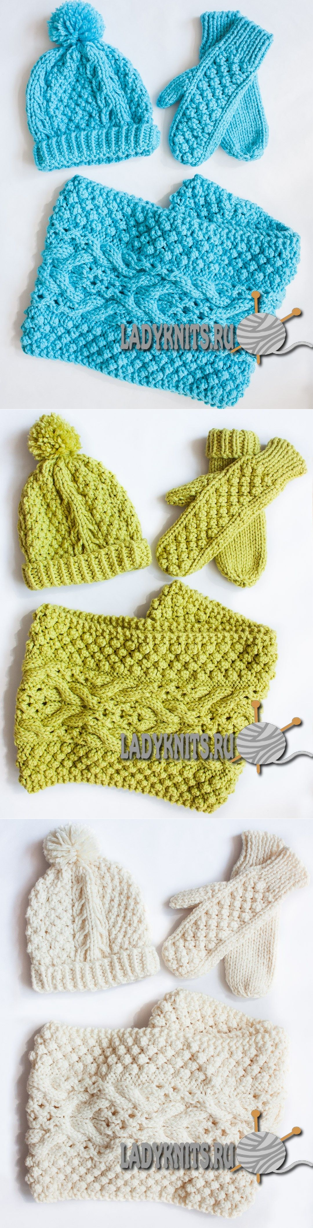 Вязаные спицами шапка, снуд и варежки от Bernat