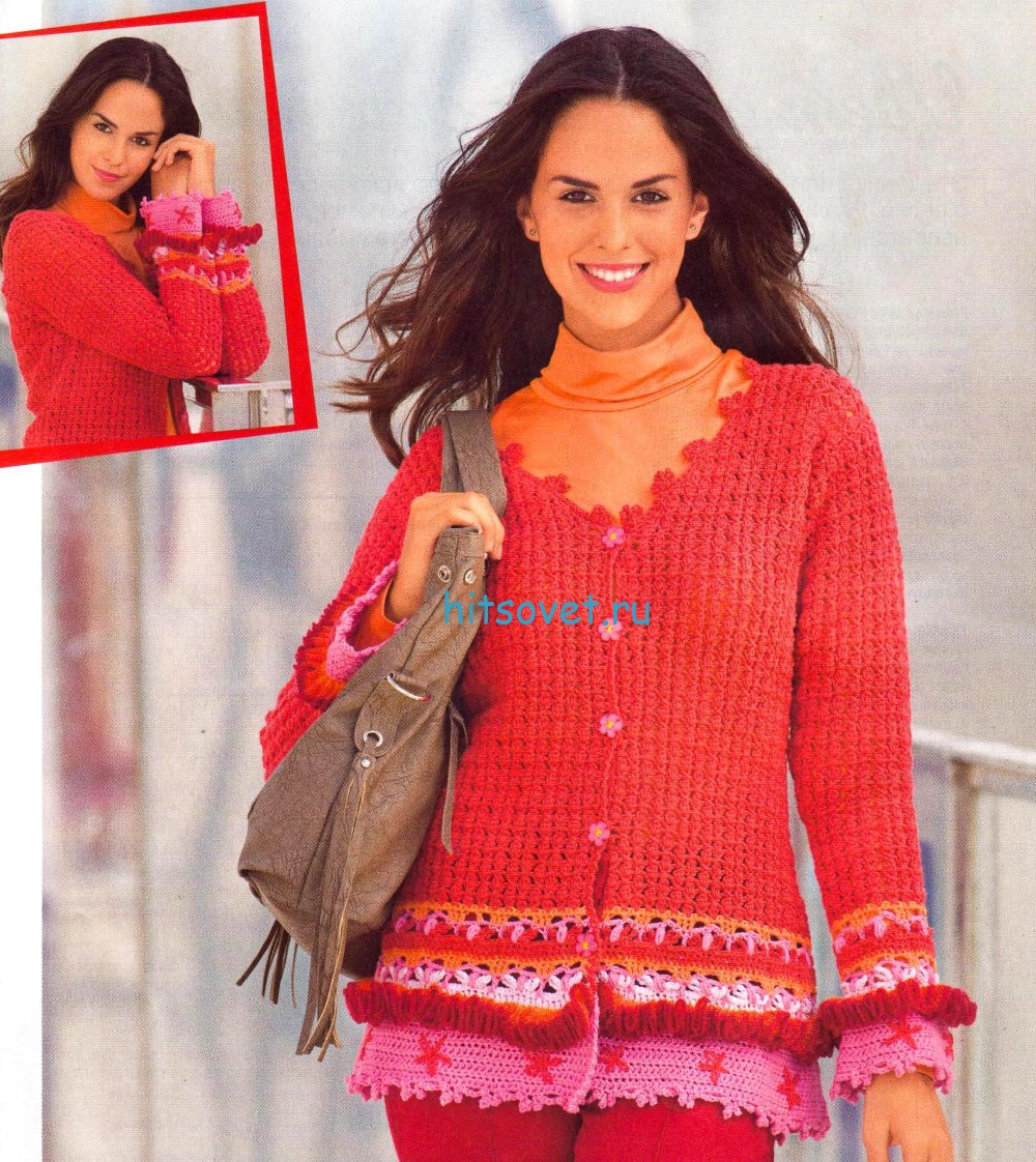 Женский вязаный жакет крючком - Хитсовет Женский вязаный жакет крючком. Для вязания жакета Вам потребуется: 500 (550) г красной, 100 (150) г розовой, по 50 г светло-розовой и оранжевой пряжи Supersoft (60% хлопка, 40% полиакрила, 130 м/50 г); 50 г красно-оранжевой пряжи Solo (50% мериносовой шерсти, 50% полиакрила, 20 м/50 г); крючок № 3,5; 5 пуговиц.