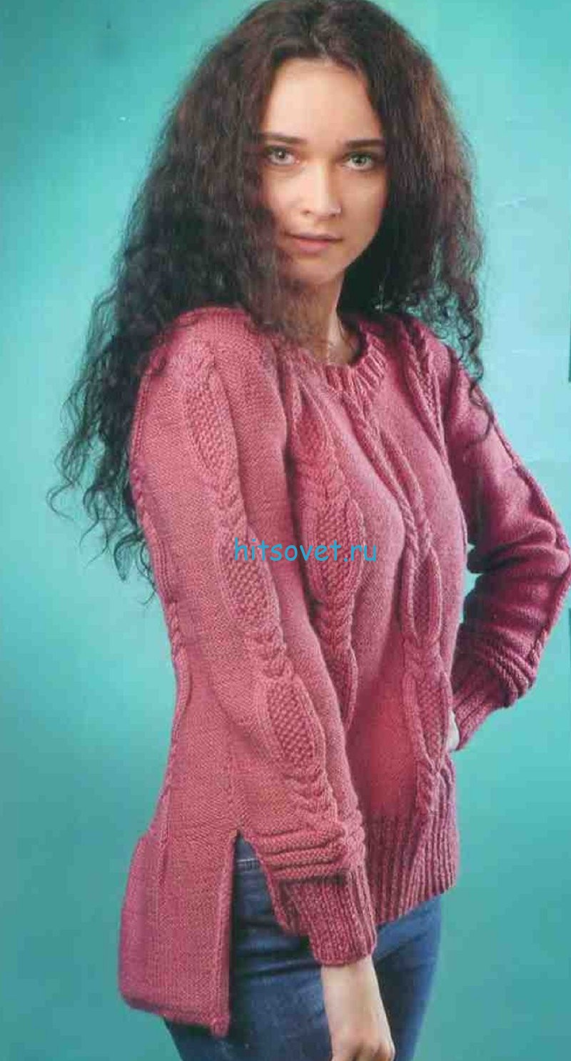 Вязаный пуловер с удлиненной спинкой - Хитсовет Вязаный пуловер с удлиненной спинкой. Для вязания женского пуловера Вам потребуется: пряжа «Соната» (50% шерсть, 50% акрил, 250/100 г) - 500 г брусничного цвета, спицы №3,5 и №2,5.