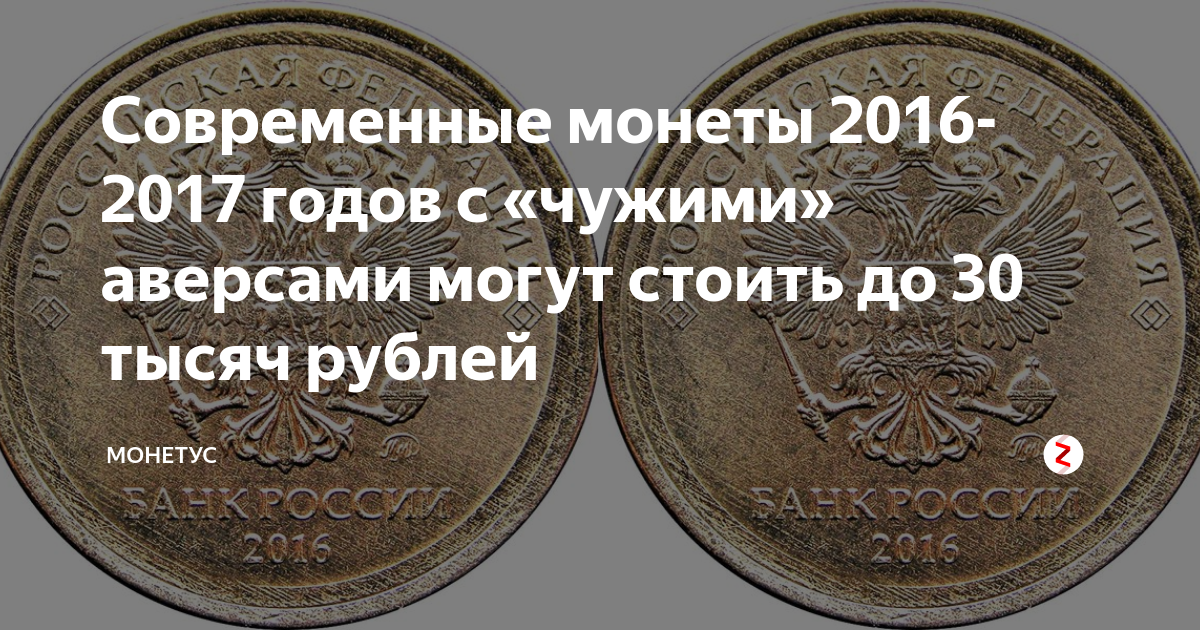 Современные монеты 2016-2017 годов с «чужими» аверсами могут стоить до 30 тысяч рублей Знак номинала с 2016 года был упразднён, и на монетах его больше не чеканят. Из-за этого на производстве нередко возникают путаницы, и в обиходе появляются монеты, аверсы которых сделаны из похожих заготовок неподходящего диаметра. В течение века существования советско-российской чеканки подобные казусы происходили не раз. Реверс у современных монет совершенно обычный - на нём изображён значок руб