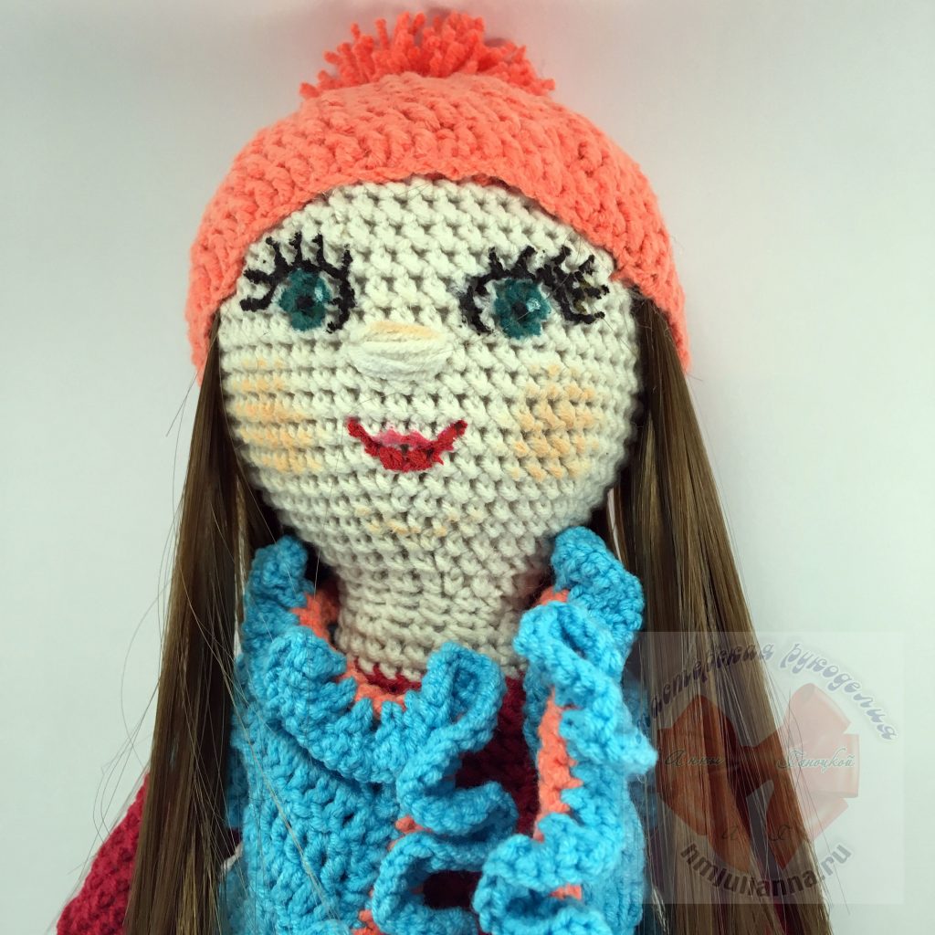 Вика, вязаная кукла купить недорого, в голубой кофте 38 см. — Очаровательная игрушка, связанная крючком вручную из пряжи Yarn Art JEANS. Лицо прорисованное вручную а именно, очаровательные глазки с ресничками, губки и румянец на лице На кукле одета голубая, съемная кофта с ажурной окантовкой Кукла хорошо стоит на ногах