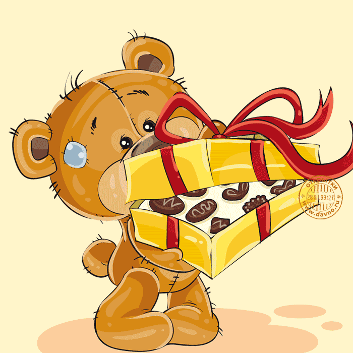 Анимационная открытка на день рождения с прикольным мишкой — открытка №12436 Анимированная открытка на день рождения с мишкой и коробкой конфет. Прикольный медвежонок открывает коробку в которой находит шоколадные конфеты и очень радуется.