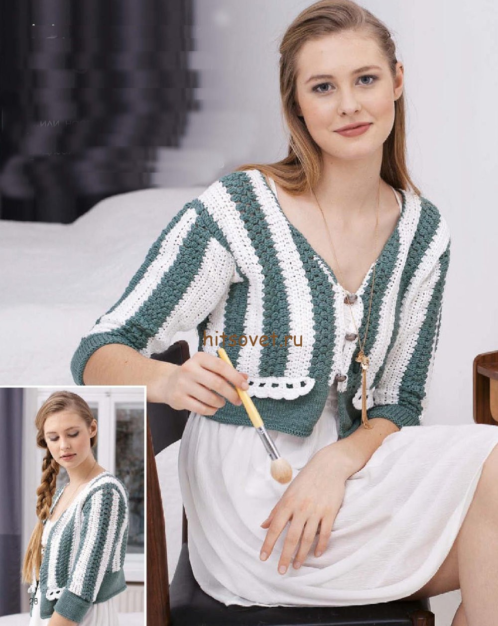 Жакет крючком схема и описание - Хитсовет Жакет крючком схема и описание. Полосатый жакет для женщин связан крючком узором из пышных столбиков. Для вязания жакета Вам потребуется 200 (250) грамм серо-зеленой и 150 (200) грамм белой пряжи, состоящей из 36% хлопка, 12% полиамида; 140 метров в 50 граммах - 200 (250) грамм серо-зеленой и 150 (200) грамм белой; крючок № 4, спицы № 4; 3 металлические пуговицы диаметром 18 мм цвета старого серебра.