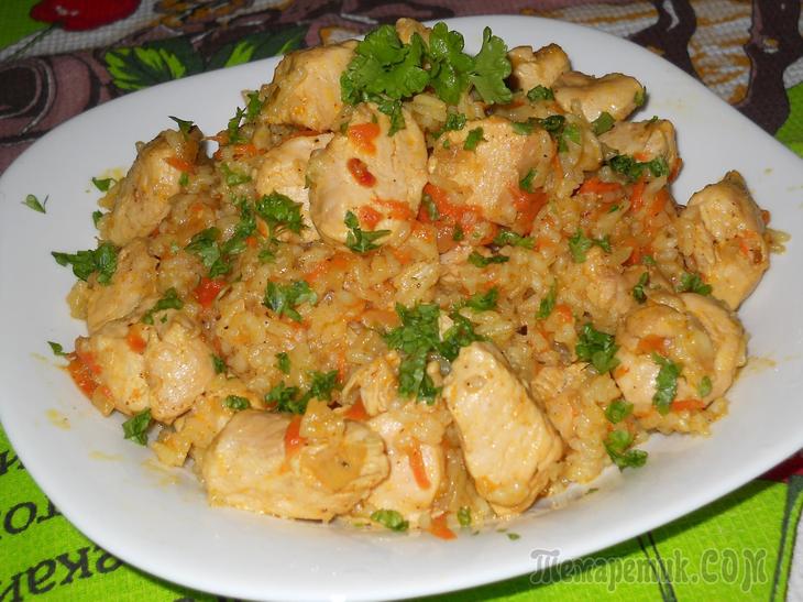Пилав из курицы. В утятницу влить растительное масло,обжарить куски курицы до корочки.Посолить,положить мелко рубленный лук и нашинкованную морковь,и немного поджарить.Затем положить 2 стакана промытого риса,посолить...