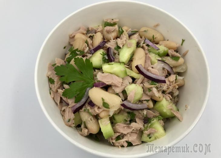 Салат с белой фасолью и тунцом Салат с тунцом и фасолью.Сытный, богатый белком салат. Не повредит фигуре. Подходит всем (включая тех, кто ограничивает себя в углеводах). Салат без майонеза, заправлен оливковым маслом.Тунец консерви...