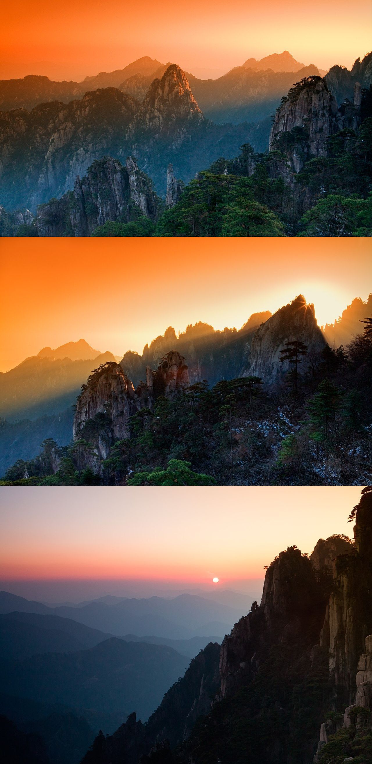 Хуаньшань: от рассвета до заката. Хуаншань - горная гряда в провинции Аньхой в восточной части Китая (примерно 300 километров на юго-запад от Шанхая). Этот район известен своими гранитными скалами, покрытыми соснами, воспетыми китайскими художниками и поэтами со времён династии Цинь.