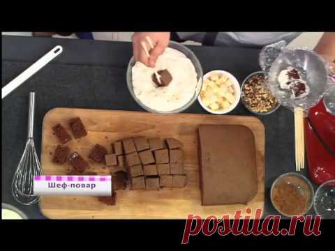 Торт "Панчо" (Renat Agzamov's Cake "Pancio") Шоколадный бисквит промазан сливочно-сметанным кремом с кусочками ананаса, грецкого ореха и украшен шоколадной глазурью