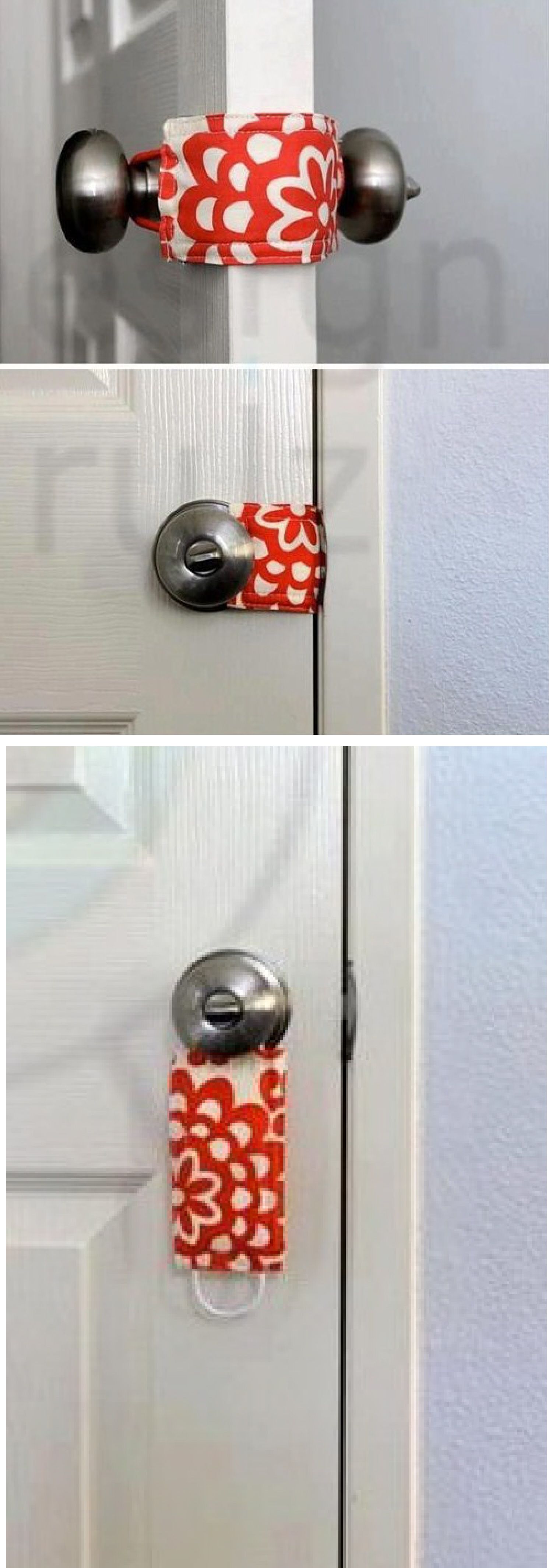 Latch Stopper ... to keep the door quiet for nap times, to keep little ones from getting "stuck" in rooms ... etc., etc., etc. No link to instructions. I am assuming simply sew two pieces of fabric together with a pony tail holder (elastic band) sewn into each end.