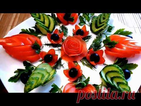 Самый простой способ нарезать помидоры и огурцы. Роза из помидора. Украшения тарелки.