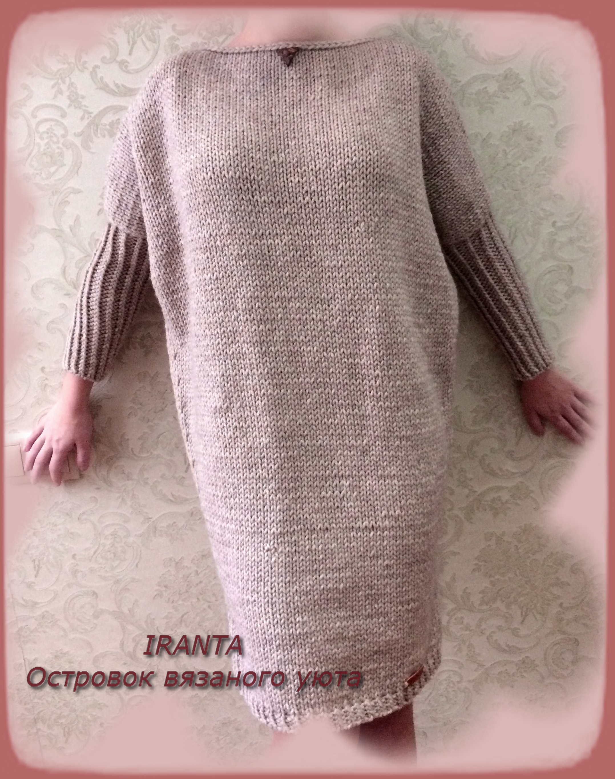 Платье-оверсайз крупной вязки с рукавом летучая мышь Платье-оверсайз крупной вязки с рукавом летучая мышь и воротом-лодочкой. Выполнено спицами из п/ш пряжи. Подробное описание, фото, схемы вязания