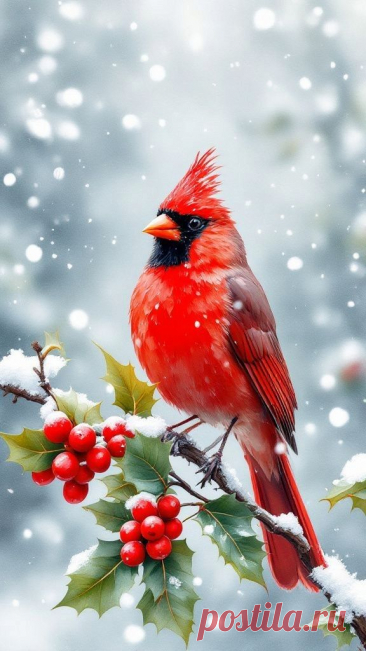 a small bird sitting on top of a tree branch covered in snow and red berries