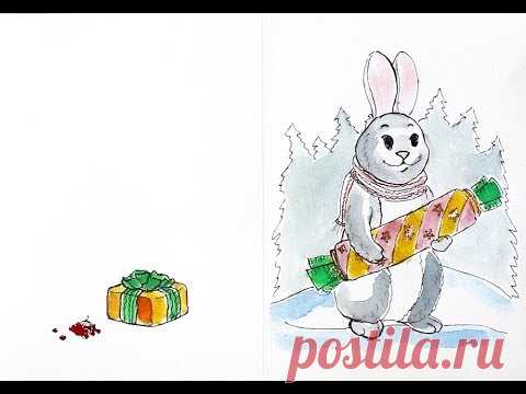 Как нарисовать открытку. Зайчик с подарком. Акварель