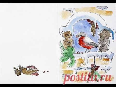Как нарисовать открытку. Снегирь на окне. Акварель